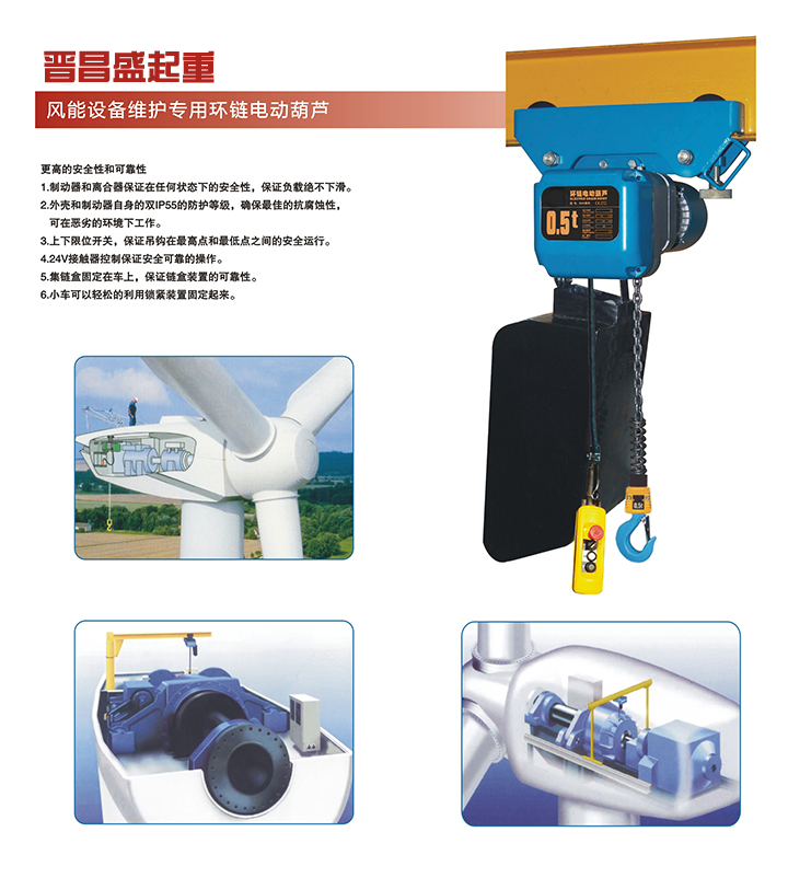 風(fēng)力專用環(huán)鏈電動葫蘆作為風(fēng)機(jī)機(jī)艙檢修設(shè)備,其可靠性直接影響風(fēng)機(jī)應(yīng)用的可持續(xù)性,根據(jù)常用風(fēng)機(jī)設(shè)計(jì)結(jié)構(gòu),單軌吊或柔性梁輕型起重機(jī)在機(jī)艙檢修中得到廣泛應(yīng)用,但因應(yīng)用條件以及環(huán)境要求,起重機(jī)配置的電動葫蘆在一些技術(shù)細(xì)節(jié)上又有別于其他環(huán)鏈電動葫蘆。